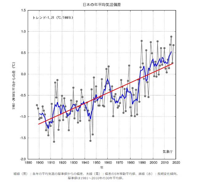 右のグラフは、気象庁が2018年に発表した「日本の平均気温の気温偏差」で、長期的には100年あたり1.21℃の割合で上昇しているのがわかります。特に1990年代以降、高温となる年が頻出しています。