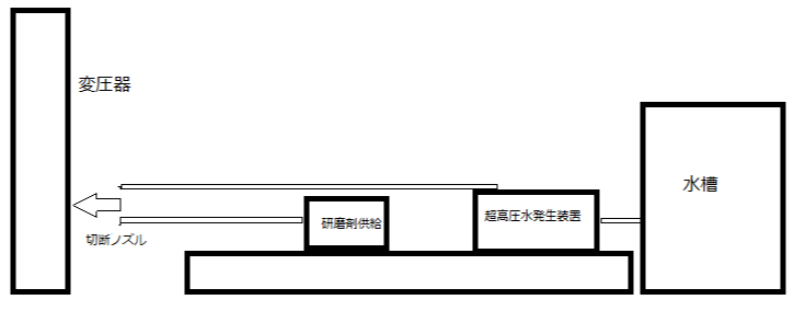高圧水に研磨剤を入れて、圧力で鉄を切断する工法です。近年では、交通事故などで車に挟まれたり、閉じ込められた被災者を救助するための切断機としても使われております。ウオーターカッターなどとも呼称されますが、この方法は変圧器の切断に非常に適していると考えております。図2のように、超高圧水発生装置、研磨材供給、防護装置から構成されております。