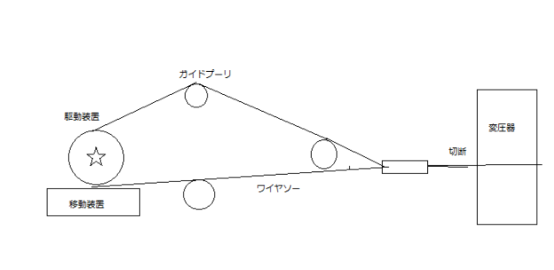 以前弊社では、発電所内にあるタービン解体に携わったことがありました。タービンは、通常の鉄素材ではなく、ニッケルやモリブデンなどが混ざった特殊鋼金属で構成されており、ガス溶断では、切断が不可能であることからワイヤソー工法で、切断したのを記憶しております。この経験からヒントを得て、変圧器の切断にも利用できないかと考えたわけです。ワイヤソー工法は、図1のように、ダイヤモンドワイヤー使用し、高回転させて切断していく工法で、ワイヤソー、ガイドプーリ、ワイヤソーの駆動機、駆動部の移動装置、冷却水供給装置、防護カバーから構成されております。