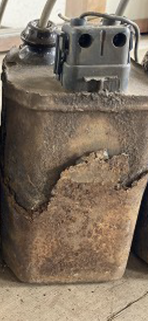 1つ目は錆(さび)と塩害による腐食状態です。変圧器やコンデンサなどのPCB廃棄物は、ほとんどが鉄製であり、湿気や雨ざらしの状態で長年保管してあれば、錆が著しい場合も多く、さらに海岸線沿いに設置されたPCB廃棄物は、塩害によって腐食しているケースも見受けられます。このような錆や塩害による腐食が、PCBの流出原因となっているのです。