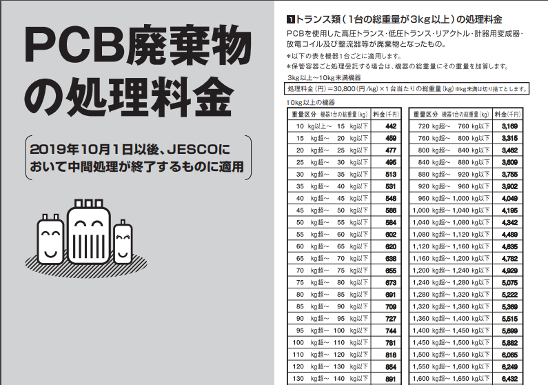 高濃度PCB処分費の処理表(JESCO HPより抜粋)