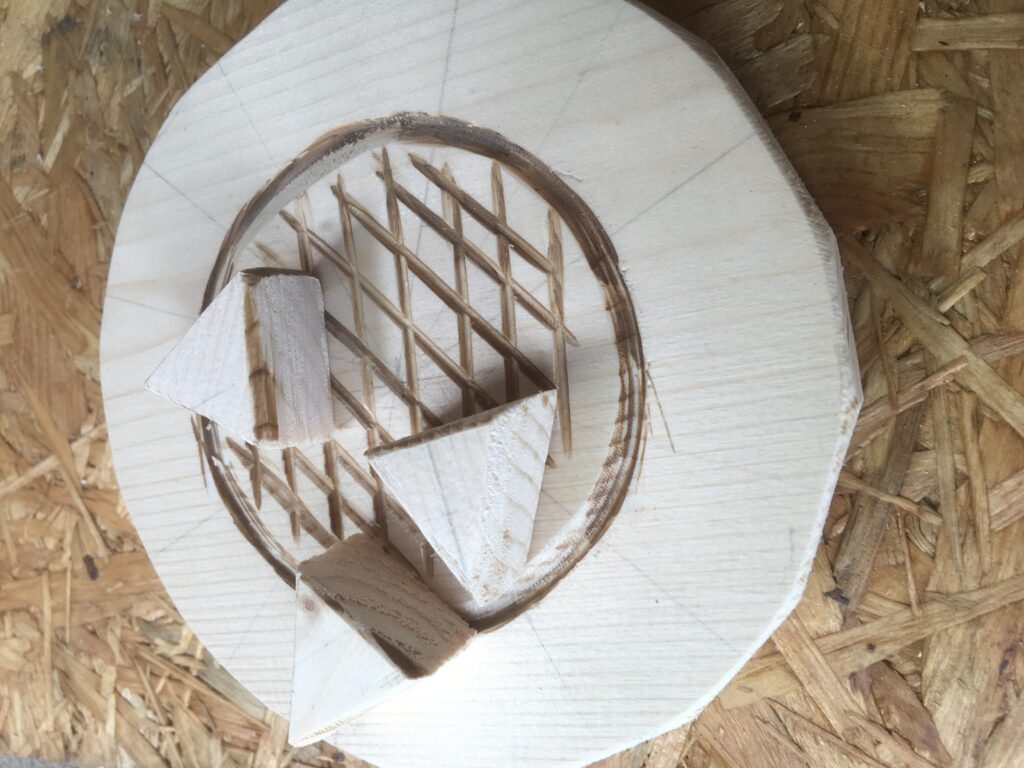 2、16面体に加工した木に、サンダーを使用して、ヒマワリの種を表現してみました。